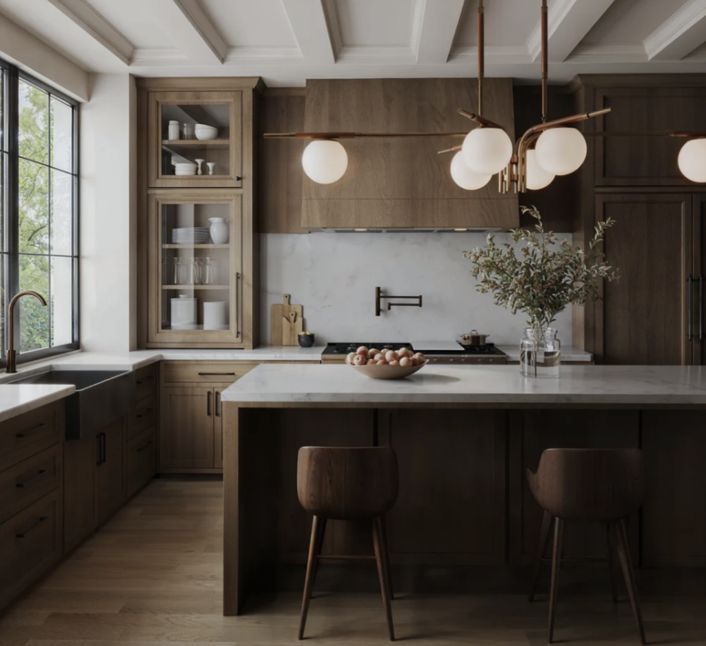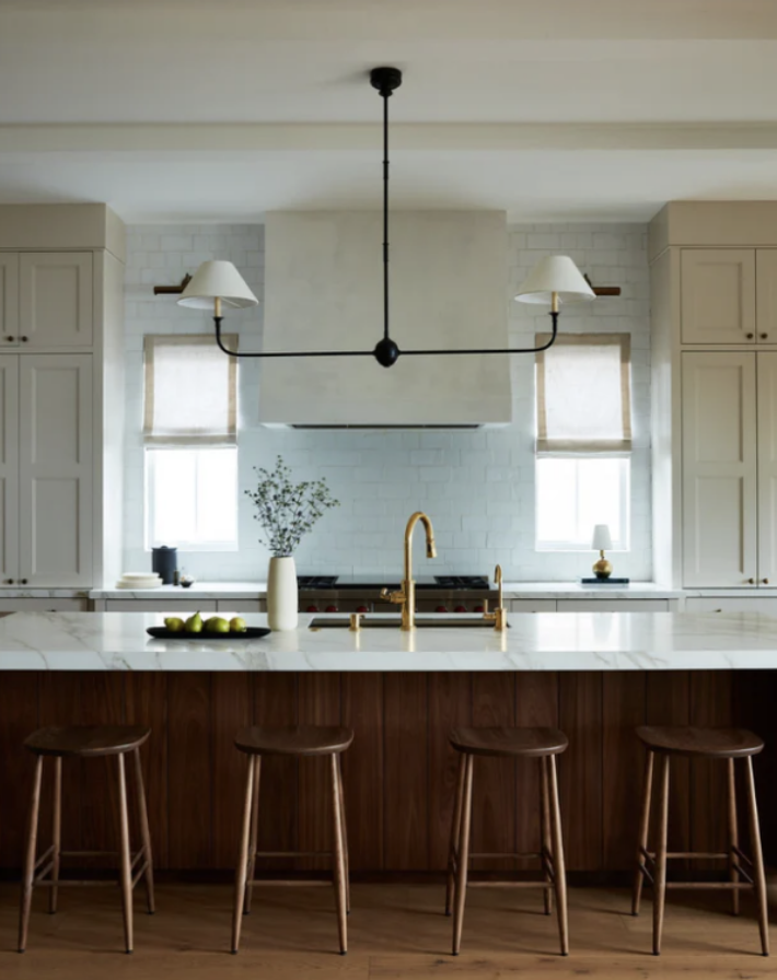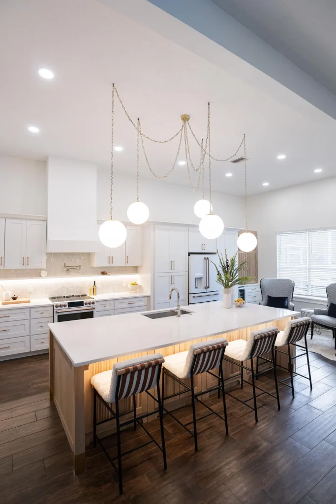 One of the most common concerns we hear from clients is about pendant lighting over an island. Many people assume you need 10-foot ceilings or a massive island to play with scale or multiple fixtures—but that’s not the case. What really matters is selecting the right fixtures for the space. And as always, creativity is where the fun begins!
